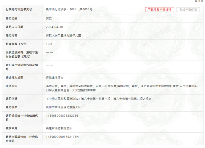 同樣是上文提及的泉州明州康復醫院,在今年4月份被福建省消防救援總隊依法查處,經查該醫院的消防設施、器材、消防安全標誌配置、設置不符合標準,消防設施、器材、消防安全標誌未保持完好有效,人員密集場所門窗設置影響逃生、滅火救援的障礙物等等,最終被主管部門處以10.8萬元罰款。