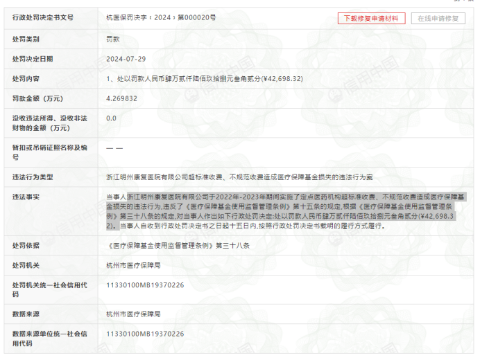 今年4月份,杭州市醫療保障局依法查處了杭州明州腦康康復醫院有限公司,經查該公司同樣也存在重複收費等造成醫療保障基金損失的違法行為(處罰文書號杭蕭醫保罰決字〔2024〕第9號)。
