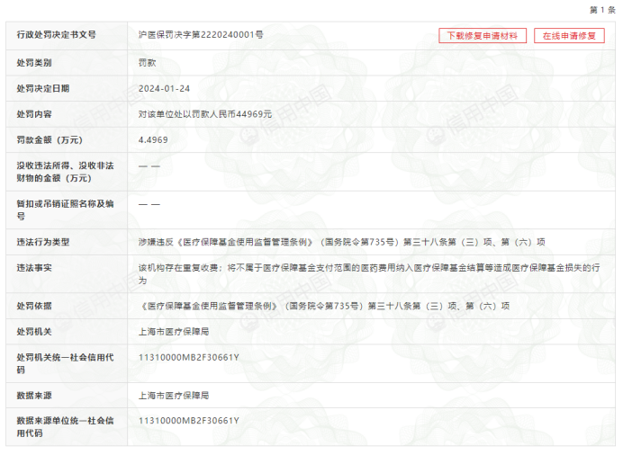 今年1月份,上海明州甬嘉康復醫院有限公司同樣也因為“存在重複收費;將不屬於醫療保障基金支付範圍的醫藥費用納入醫療保障基金結算等造成醫療保障基金損失的行為”,被上海醫療保障局依法查處,最終予以4.5萬元的罰款(處罰文書號:滬醫保罰決字第2220240001號)。