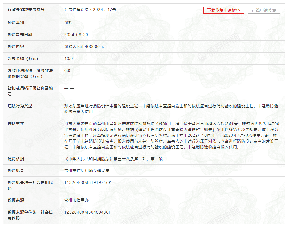 今年8月份常州市住建局對常州中吳明州康復醫院進行了查處,監管部門發現該醫院翻新改造裝修項目工程,該工程為特殊建設工程,應當按規定進行消防設計審查和消防驗收。該工程於2022年10月開工,2023年4月投入使用**,但該工程在開工前未經消防設計審查,投入使用前也未經消防驗收。**