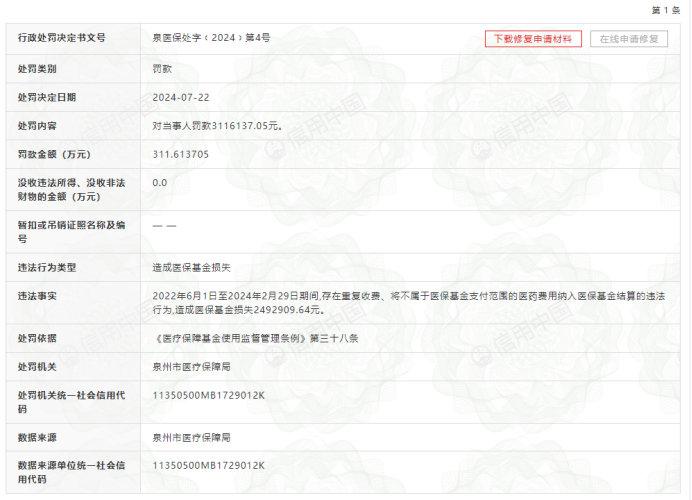 今年7月份,泉州明州康復醫院有限公司因為“在2022年6月1日至2024年2月29日期間,存在重複收費、將不屬於醫保基金支付範圍的醫藥費用納入醫保基金結算的違法行為**,造成醫保基金損失249.3萬元。**”被泉州市醫療保障局查處,對該醫院處以311.61萬元的重罰。