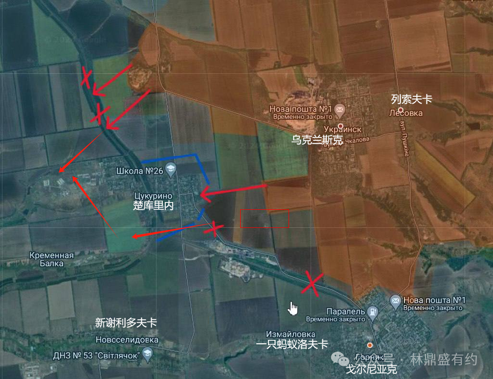 🔴俄軍奪佔區域樞紐的烏克蘭斯克之後,烏克蘭斯克的殘軍撤退到了楚庫裏內。但是,俄軍採取了“避實擊虛”戰略,大軍雖然向楚庫裏內方向追擊烏軍前進,但是,並未在這個正面與烏軍強力對打,而是走側面迂迴的道路,從楚庫裏內的南北兩個方向發力,尋求從外圍包圍楚庫裏內,眼下也正在縮小這個包圍圈。時機初步成熟之後,近日,俄軍開始從東側對楚庫裏內發起攻擊,已兵臨城下,很快會展開巷戰。但眼下的態勢,屬於圍三闕一,東側的攻擊只是一種極限施壓行為。如此一來,就可能會動搖守軍的意志。當然,守軍尚未向城西收縮,還是致力於先頂一頂再説;