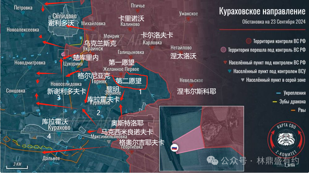🔴俄軍一旦實現奪佔馬克西米良諾夫卡,與奧斯特洛耶連成一片,就有機會一路向北穿插,加上戈爾尼亞克已處於俄軍包圍狀態,一旦被俄軍奪佔。那麼,俄軍南北對進,庫拉霍夫卡-黎明就有可能最終處於俄軍包圍之中;