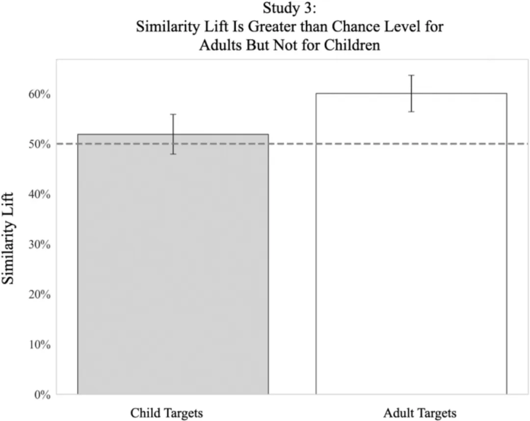 結果發現,擁有相同名字的成人長相相似度達60.05 %,顯著高於隨機概率50% 。相比之下,擁有相同名字的兒童並沒有表現出長相相似性(51.88%)。