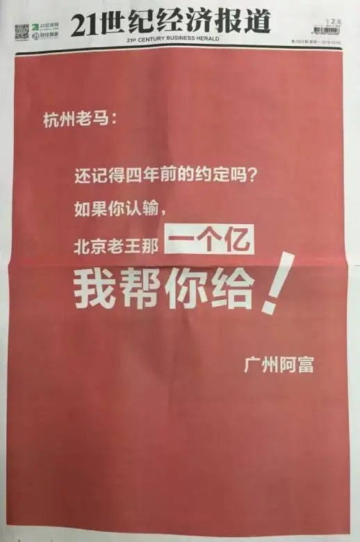 2016年左右,一個名為“廣州阿富”的人,先後兩次包下知名報紙的整個版面頭條,只為和彼時的商業教父馬雲叫板——