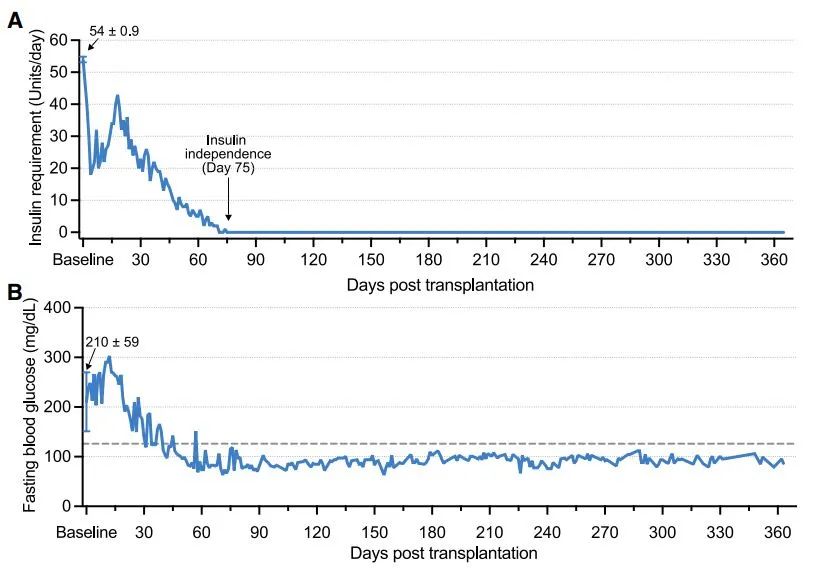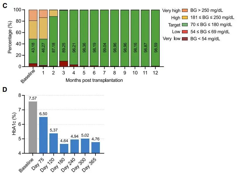 研究結果顯示,在腹直肌前鞘下移植自體CiPS細胞分化胰島後,患者的空腹血糖水平逐步恢復正常,外源胰島素需要量持續下降,從移植後第75天開始,實現了完全穩定地脱離胰島素注射治療。移植5個月後,患者血糖達標率已從基線值43.18%持續提高到98%以上,並維持在該水平,表明血糖控制穩定。另一個重要指標糖化血紅蛋白(HbA1c),在移植後一年降至4.76%,表明全身血糖水平長期處於正常狀態。