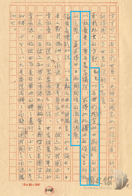 我們應該抱定壯士斷腕的決心,以放棄東三省為最高犧牲,求得此外的疆土的保全與行政的完整,並求得中日兩國關係的徹底調整。