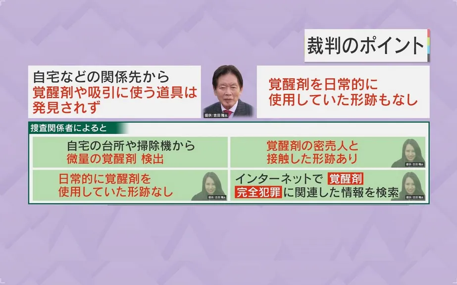 直到近日的審判上,警方出示證據表明,當時野崎幸助的襯衫、牙刷、杯子都檢測出興奮劑,而須藤早貴的墨鏡、高跟鞋、護照封套等物品上也檢測出了興奮劑。