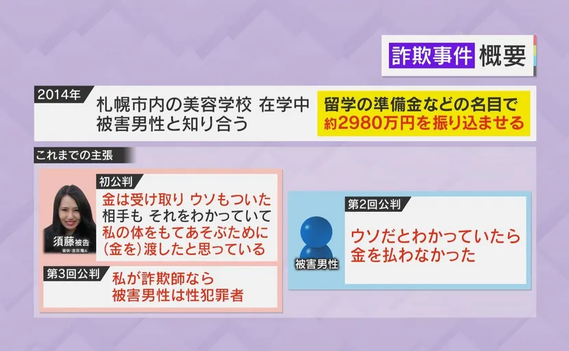 2014年,須藤在美容學校就讀期間與被害男性相識,“以準備留學等名義,讓被害男性匯款約2980萬日元”。須藤説:“我收到了錢,也撒了謊。對方也明白這一點,因為他是為了玩弄我的身體而(付錢)的。”並聲稱,如果自己是騙子,那麼受害男子就是性犯罪者。