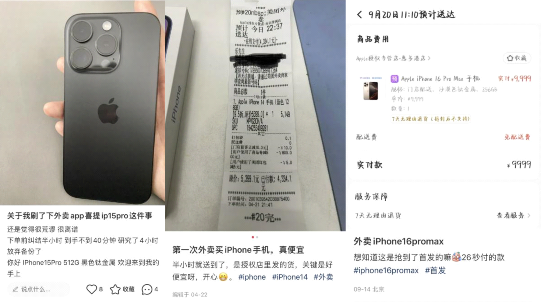 事實上,在20號當天,除了蘋果直營店開啓線下發售和取貨,美團、餓了麼、京東等外賣平台也開啓了八點搶購,標註着30分鐘/1小時極速送蘋果16系列手機。並且這些平台在13日也開啓了預售,搶到的用户也能享受在20號當天送達首發新機。這意味着十多年前蘋果直營店壟斷的局面已經被瓦解,轉而迎來的是多方發售的場景。