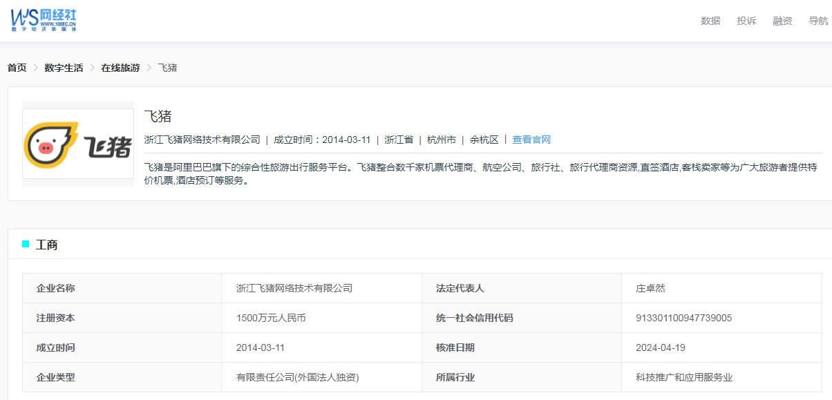 從網經社企業庫瞭解,飛豬隸屬於浙江飛豬網絡技術有限公司,位於浙江省杭州市餘杭區,成立於2014年3月11日,法定代表人莊卓然。