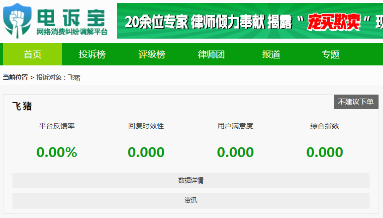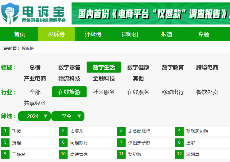 根據“電訴寶”2024年至今受理的數字生活領域用户有效投訴顯示(依據投訴量排行),飛豬排名第一位,最新評級為“不建議下單”。其他被投訴的類似電商平台還有:去哪兒、走着瞧旅行、聯聯周邊遊、攜程、同程旅行、俠侶親子游、途家、馬蜂窩、高鐵管家、騎驢遊、旅划算。