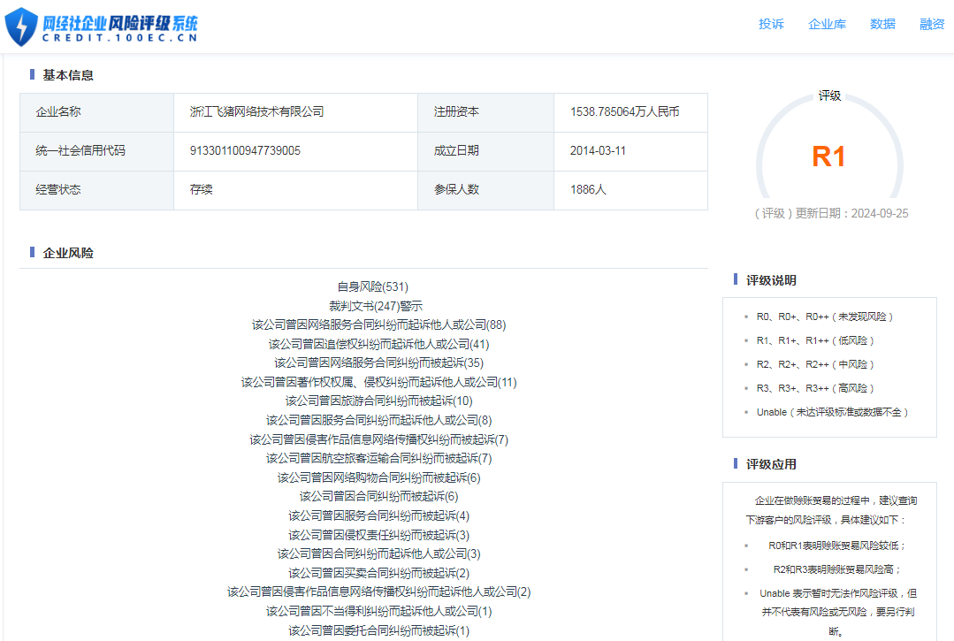據“網經社企業風險評級系統”顯示,飛豬隸屬的浙江飛豬網絡技術有限公司的風險評級為“R1”,公司目前所處低風險。