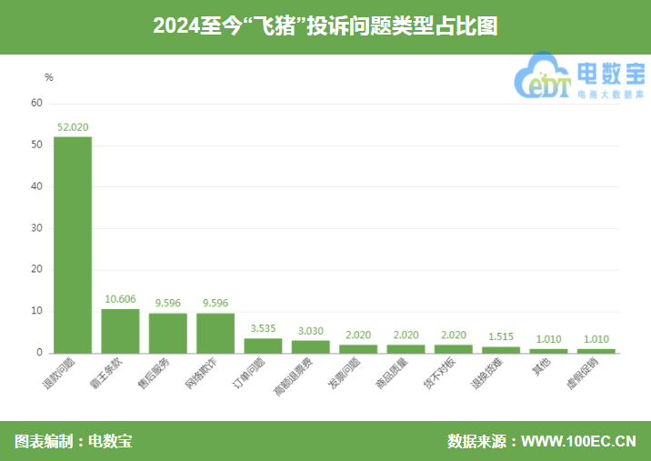 此外,國內知名網絡消費糾紛調解平台“電訴寶”受理用户維權案例顯示,“飛豬”還涉嫌存在退款問題、售後服務、霸王條款、網絡欺詐、高額退票費、訂單問題、退換貨難、發票問題、貨不對板、商品質量、其他等問題。