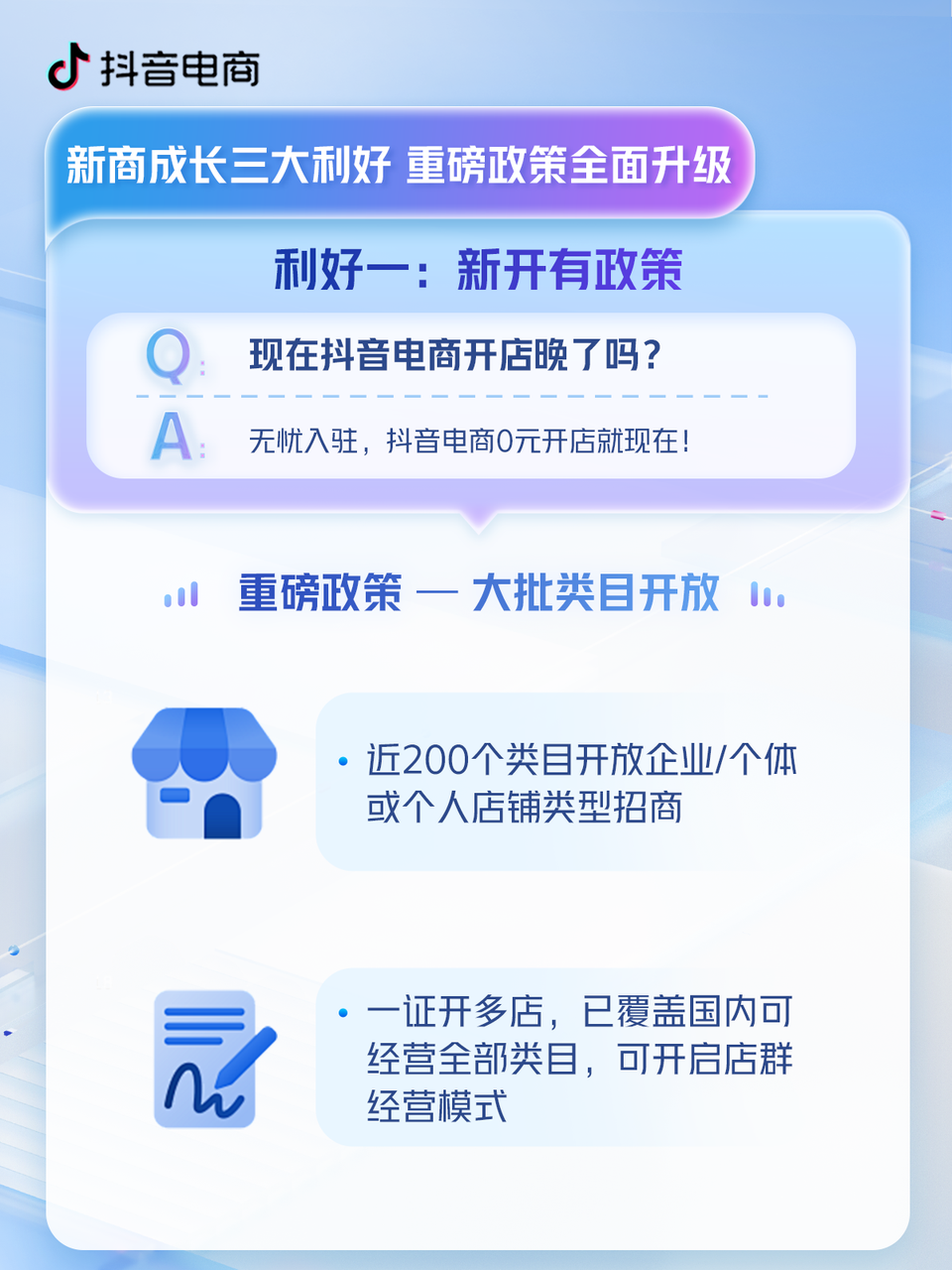 抖音電商的新商政策還在持續,在生意“從0到1”的階段幫助中小商家降低開始生意的成本。近期發佈的三大利好政策覆蓋了一個新商户從入駐到冷啓動再到成長的全流程,希望能讓賣家更加輕鬆地在抖音電商上面開店和獲利。