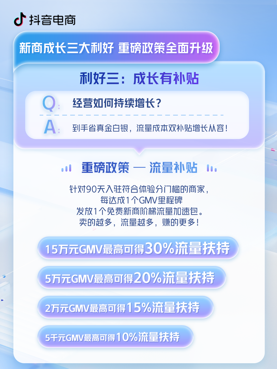最近,抖音電商對外發布新商成長三大利好政策,它們分別針對的是商家入駐、冷啓、成長三個階段的需求,平台通過政策對這些需求給予相對應的幫助。這是抖音電商扶持商家政策的全面升級,希望幫助中小商家在抖音電商無憂經營,穩定增長。