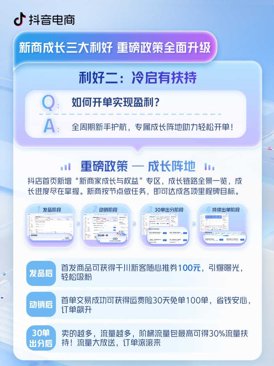 抖音電商對這個痛點有所察覺,“冷啓有扶持 ”就是為了在商家入駐之後幫助他們學習和成長、讓商家消除迷茫。針對此,平台提出了“全週期新手保護”的概念,其中一個重要的幫助策略是在抖店官網上線了“新商家成長與權益”專區,讓新商户跟着平台做任務,在發品、動銷等各個冷啓動階段不斷完成目標、獲得獎勵,進而實現快速成長。例如,每當商户發佈一個新品時,就會獲得千川的新客100元“隨心推”券等;賣出第一單後,可以獲得運費險30天100單免單的權益。