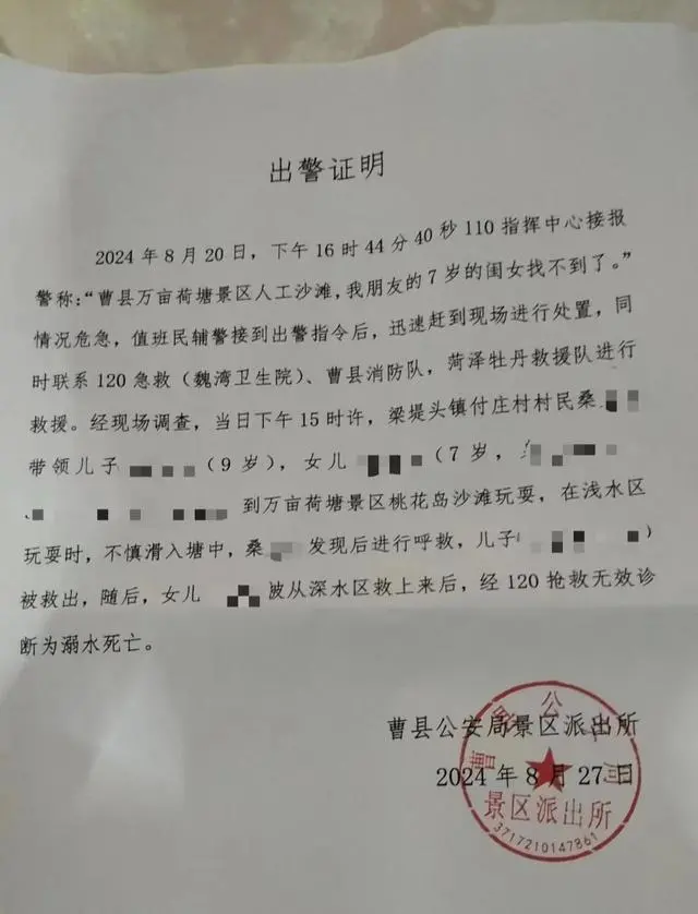 曹縣公安局景區派出所出具的《出警證明》顯示,警方接警的時間為下午4時44分,接警後,警方聯繫120急救、縣消防隊、菏澤牡丹救援隊進行救援。