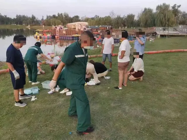 根據事發現場照片顯示,水域內已沒有人,岸邊多人圍着一名孩子,正在開展救援。現場可以看到漂浮警戒線,但未見岸邊有警示標識等,也未見救援人員崗哨。