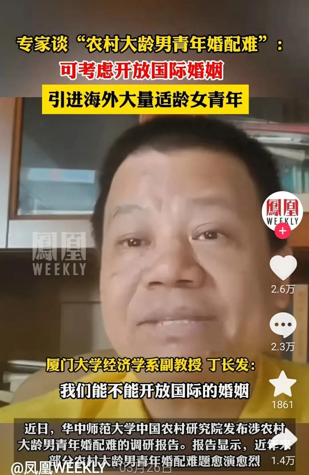 廈門大學經濟學系副教授丁長髮在談”農村大齡男青年婚配難“問題時,提出可以開放國際婚姻,引進海外大量適齡女青年。這簡直為男同胞們的”洋妞運動“提供專家支撐了,他們搖旗大喊,要求制定”國外洋妞引進計劃“,解決他們的婚戀難題。