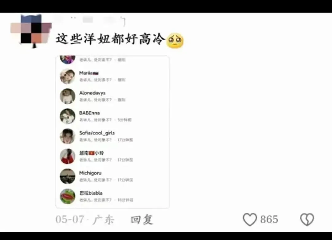 更有甚者,批量去私信外國女博主“老妹兒,要不要和我處對象?”博主置之不理,便倒打一耙責怪:“洋妞真是太高冷了”。