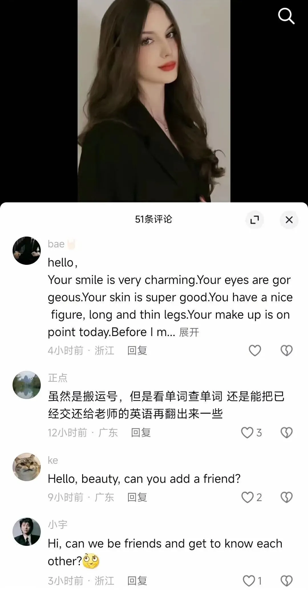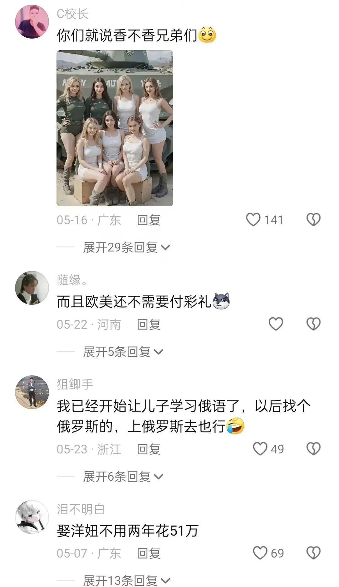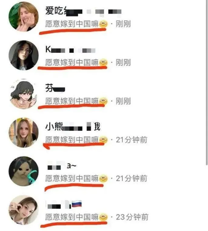 不禁讓人懷疑,這些人是真的覺得自己可以通過在某音上私信一下評論一下就娶到外國美女嗎?我一開始只是以為他們在玩梗,後來我發現我錯了,他們是真心是這樣以為的。