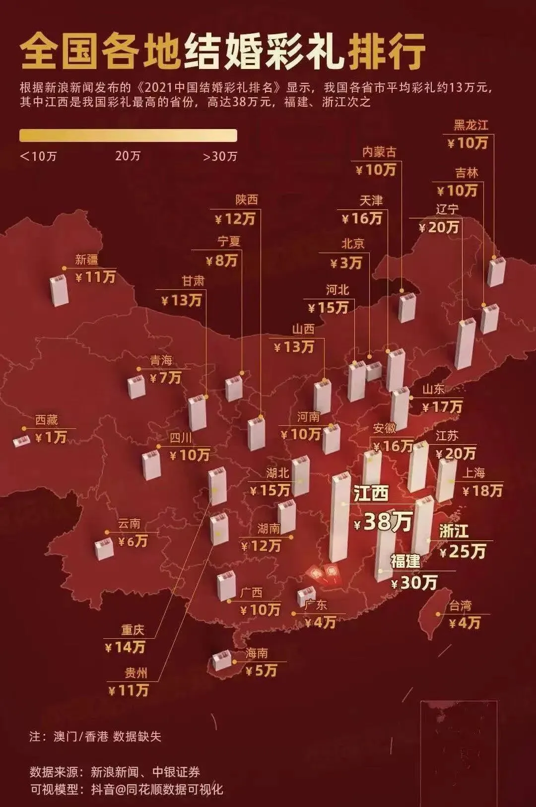 有數據顯示,2021年我國更省市平均彩禮約為13萬元,其中江西市我國彩禮最高的省份,高達38萬元,福建和浙江分列第二、第三、也達到了30萬和25萬元。