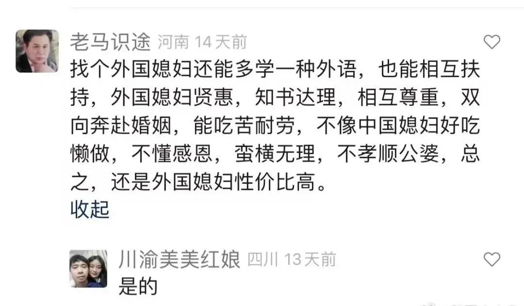 只能靠彩禮娶到老婆的人,現在已連彩禮都不願意付出,指望着“不要彩禮”的外國女生看上他們。