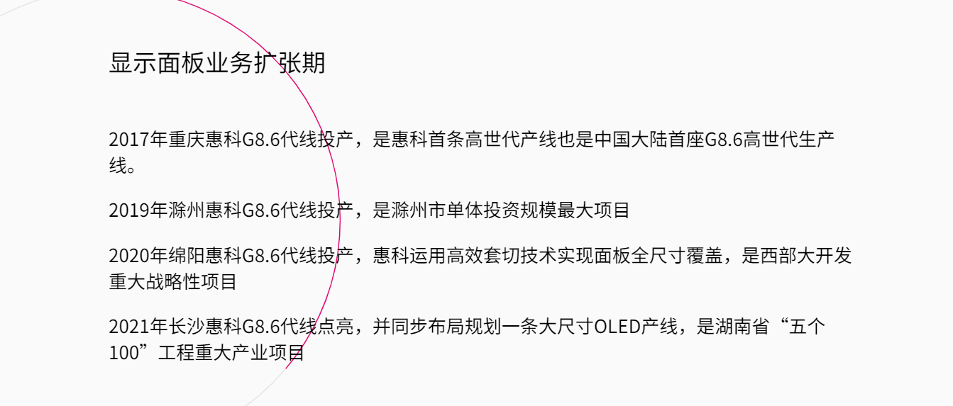 惠科進入液晶面板產業的時間更晚,從2017年至2021年先後建成了4條8.6代液晶面板生產線。
