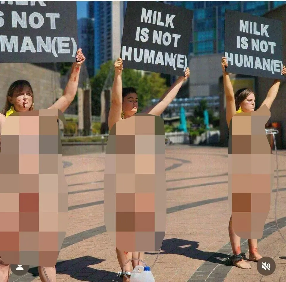 看到那些穿着肉色緊身衣接受擠奶的婦女,有不少人當場宣佈開始吃素生涯,改喝植物奶。