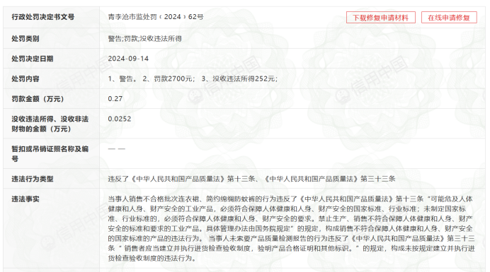 今年9月14日,青島孩子王兒童用品有限公司李滄萬達店銷售不合格批次簡約綿綢防蚊褲、連衣裙的行為違反了《中華人民共和國產品質量法》,被當地市場監管部門處罰。