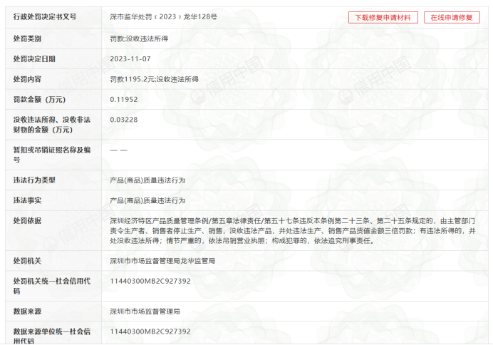 去年11月份,深圳市童聯兒童用品有限公司也因為產品(商品)質量違法行為被深圳市市場監管局予以處罰。而且該公司在2022年已經因為銷售檢驗不合格的兒童餐椅被市場監管部門處罰過(處罰文書號:深市監華處罰〔2022〕龍華47號),此次產品質量再出問題已經是再犯了。