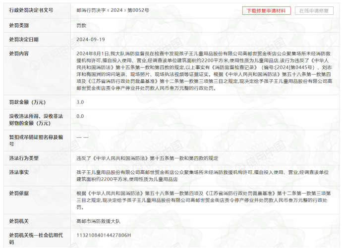 **就在今年9月19日,孩子王兒童用品股份有限公司高郵世貿金街店被當地消防部門處罰了。處罰信息顯示,8月1日,高郵市消防救援大隊消防監督員在檢查中發現孩子王高郵世貿金街店公眾聚集場所未經消防救援機構許可,擅自投入使用、營業,**經調查該單位建築面積約2200平方米,使用性質為兒童用品店,該行為違反了《消防法》第十五條第一款和第四款的規定,最終該門店被罰款,並被責令停產停業進行整頓。