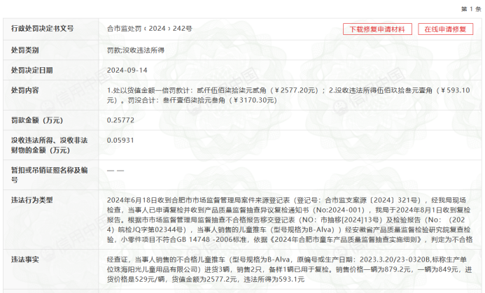 同樣在9月14日,合肥市市場監管部門對安徽童聯孩子王兒童用品有限公司(以下簡稱安徽孩子王)下達了處罰決定,處罰決定書顯示,安徽孩子王銷售的兒童推車(型號規格為B-Alva,原編號或生產日期:2023.3.20/23-0320B,標稱生產單位珠海陽光兒童用品有限公司),經過市市場監管部門抽檢和安徽省產品質量監督檢驗研究院複查檢驗,小零件項目不符合GB 14748 -2006標準,依據《2024年合肥市童車產品質量監督抽查實施細則》,判定為不合格。