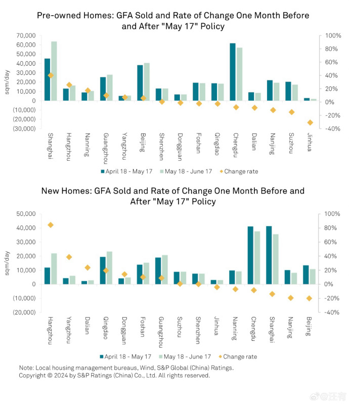我們看看上一輪政策,5月17日的政策也挺大陣仗,降低首付啊這些。對房屋銷售面積影響不算特別大。頭部城市對政策反饋靈敏度超過二三線城市。