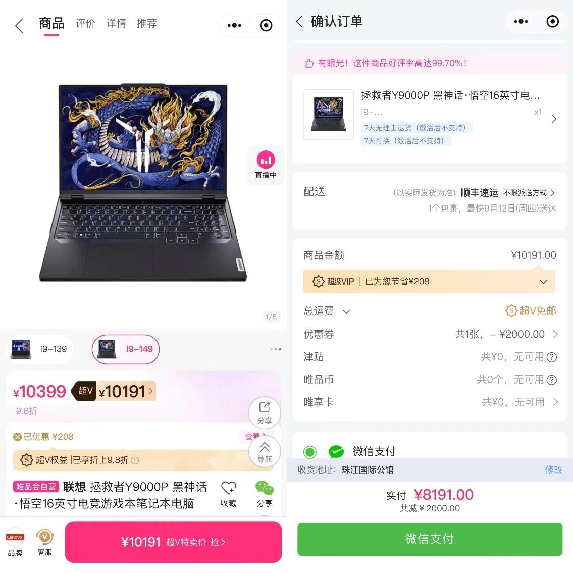 二是,電商還帶來了力度升級。以唯品會為例,平台本身就有一定折扣,會員還能折上再折,現在再疊加官方大額補貼,消費者也就能省下更多。比如一台聯想拯救者Y9000P i9-149,原價10399元的電腦,補貼能拿到2000元,再疊加唯品會平台折扣、超V折扣,最後到手價直接來到了8191元。