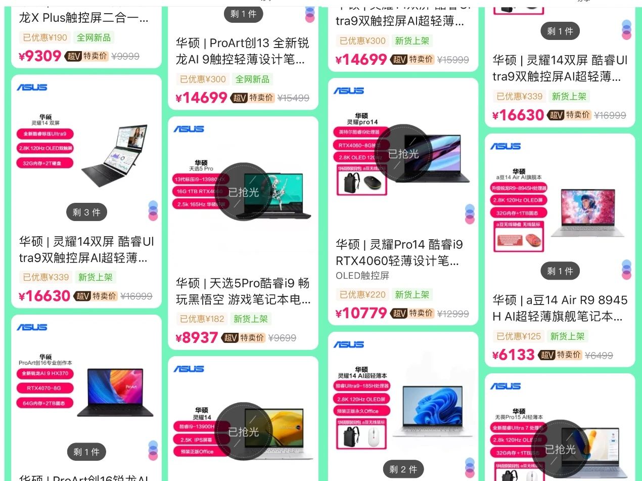 爆款產品則迎來了更快的銷量衝高。目前在唯品會,多款爆款筆記本均處於暫時售罄狀態,其中,大熱的華碩天選5Pro遊戲筆記本、華為MateBook 14 2023款、華碩靈耀Pro14輕薄筆記本、蘋果2020款MacBook Air 13.3英寸M1等顯示“已搶光”,平台正加緊補貨。