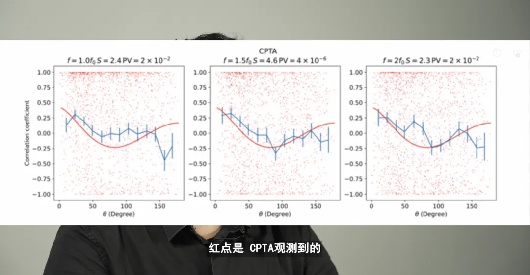 那麼,CPTA測量到的信號是否真的來源於納赫茲引力波呢?判據就是,各個脈衝星對的相關係數與它們之間在天球面上的夾角(θ)之間的關係是否符合HD曲線。CPTA的結果如圖所示,其中紅色曲線為HD曲線,紅點是 CPTA觀測到的每對脈衝星之間的相關係數,藍色帶有誤差棒的曲線是紅色點平均後的結果。