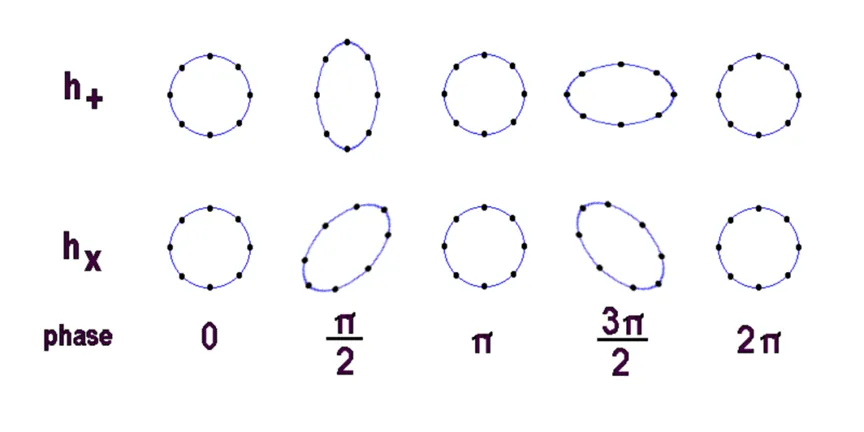 引力波是橫波,它有兩種偏振模式:+模式和x模式。圖中黑色點代表自由的質點。
