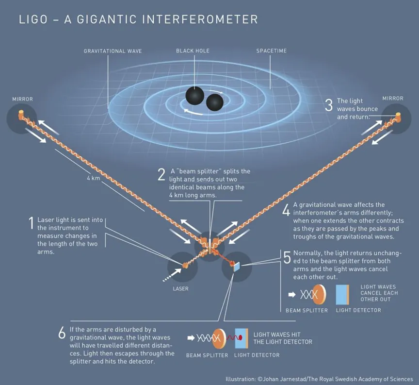 如果我們在垂直於引力波的傳播方向佈置一些自由的質點,當引力波到達的時候,這些質點之間的距離就會發生振盪。我們就是利用這種效應來探測引力波的,所以簡單來説,引力波探測器就是高精度的距離測量儀器。