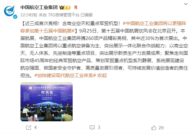 同時,航空工業也官宣了本屆航展的展出方案,航空工業指出,本屆航展上,航空工業室內外展陳面積將達到2萬平方米,共有260餘項產品亮相,相對上一屆增幅達到四分之一,近三成產品為首次展出。