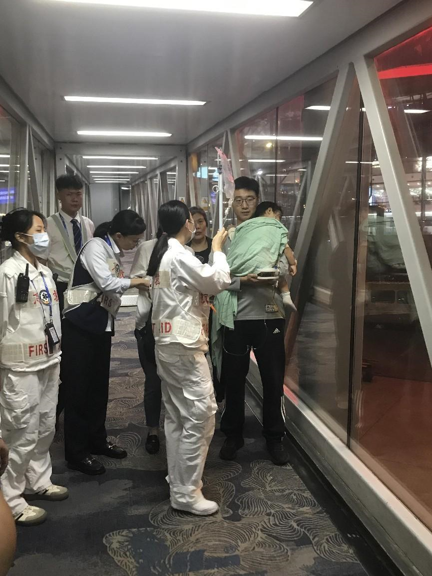 19時38分,SC8883航班開始登機。地面服務部工作人員主動上前幫忙,在醫護人員的囑咐下將兒童旅客小心翼翼的引導至客艙。20時07分,航班順利起飛。