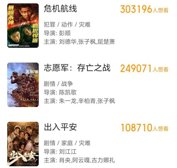 度過疲軟至極的9月大盤後,兩相對比之下,今年國慶檔影片完全可以稱得上一句“大牌雲集,類型眾多”。真人電影方面,除去歌舞片《只此青綠》等明顯無競爭力的電影,值得一提、有爆款潛力的電影共有七部。陳凱歌導演,朱一龍、辛柏青等人主演,早早瞄準國慶檔的傳統主旋律題材《志願軍:存亡之戰》,肖央、趙麗穎、劉燁主演的爆裂打拐電影《浴火之路》,劉德華、張子楓、屈楚蕭主演的空中動作大片《危機航線》;《人生大事》導演新作,肖央、阿雲嘎主演的《出入平安》;陸川導演“七年磨一劍”,王俊凱主演的《749局》;甯浩導演,葛優和李雪琴主演的喜劇片《爆款好人》;魏巒導演,成龍、魏翔主演的動作喜劇片《熊貓計劃》。