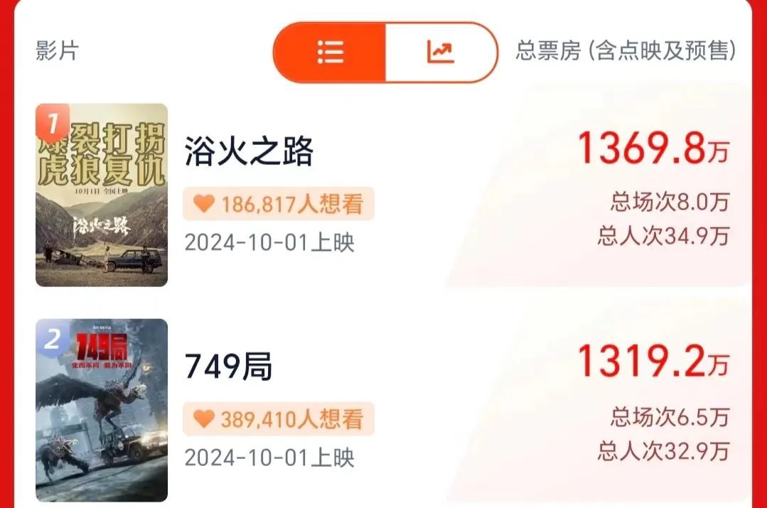 《浴火之路》是趙麗穎擔任女主角的大製作電影第一次在如此重要的檔期上映,從其工作室營業情況和粉絲表現來看,她們非常看好並期待《浴火之路》。另一位頂流王俊凱主演的《749局》,也是類似的局面。這也是為何,這兩部影片能在預售中分列冠亞軍。