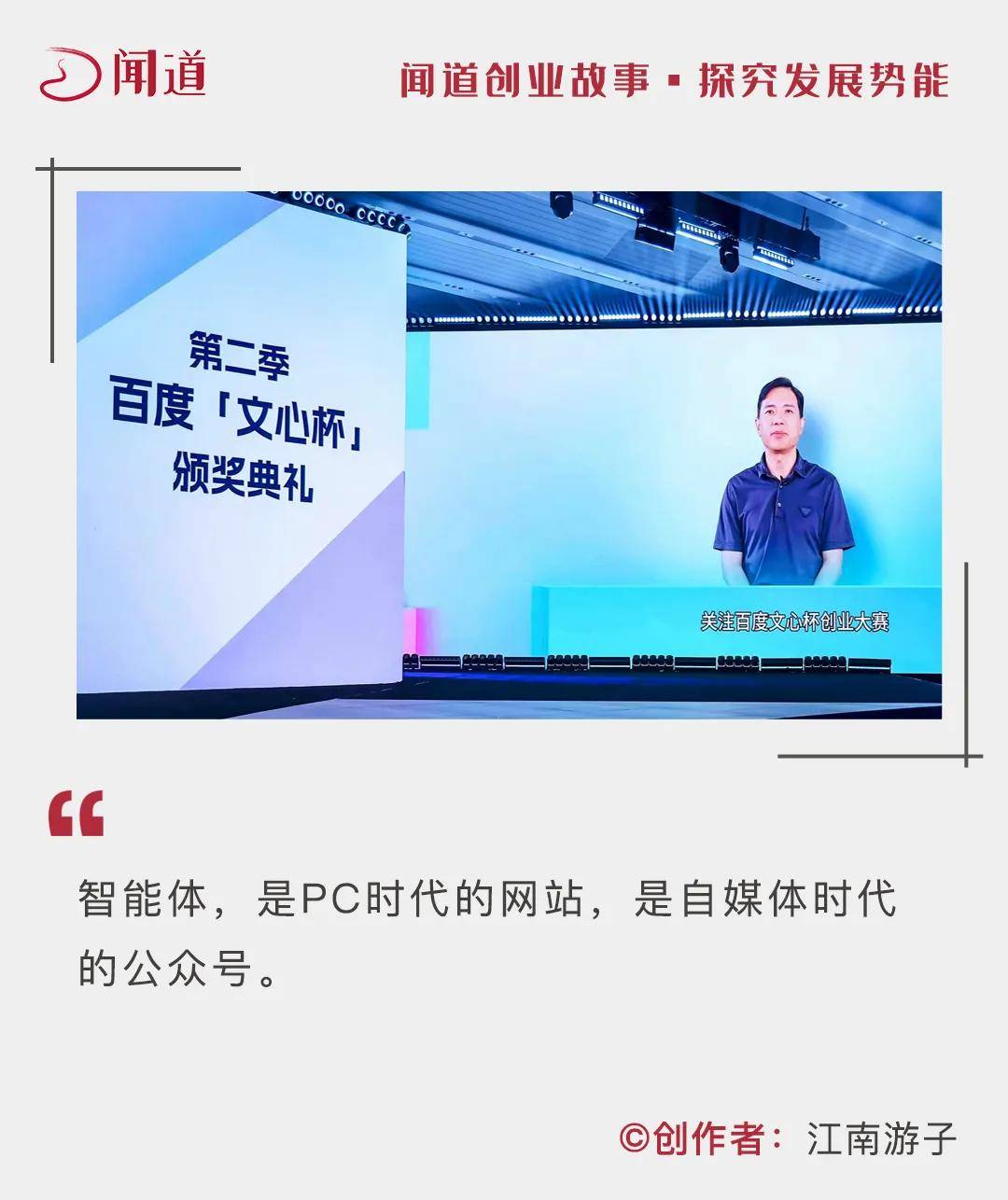 在給本屆創業大賽入圍者頒獎致辭中,李彥宏毫不掩飾地宣佈:智能體是他最看好的AI原生應用發展方向,相當於PC時代的網站以及自媒體時代的公眾號。