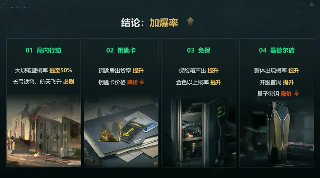 另一點關於出金率的問題,《三角洲行動》並沒有一味地降低出金率。相反,在開服後,整體出金率不僅有所提升,而且在公測的前八天,曼德爾磚的刷新率還會限時增加。