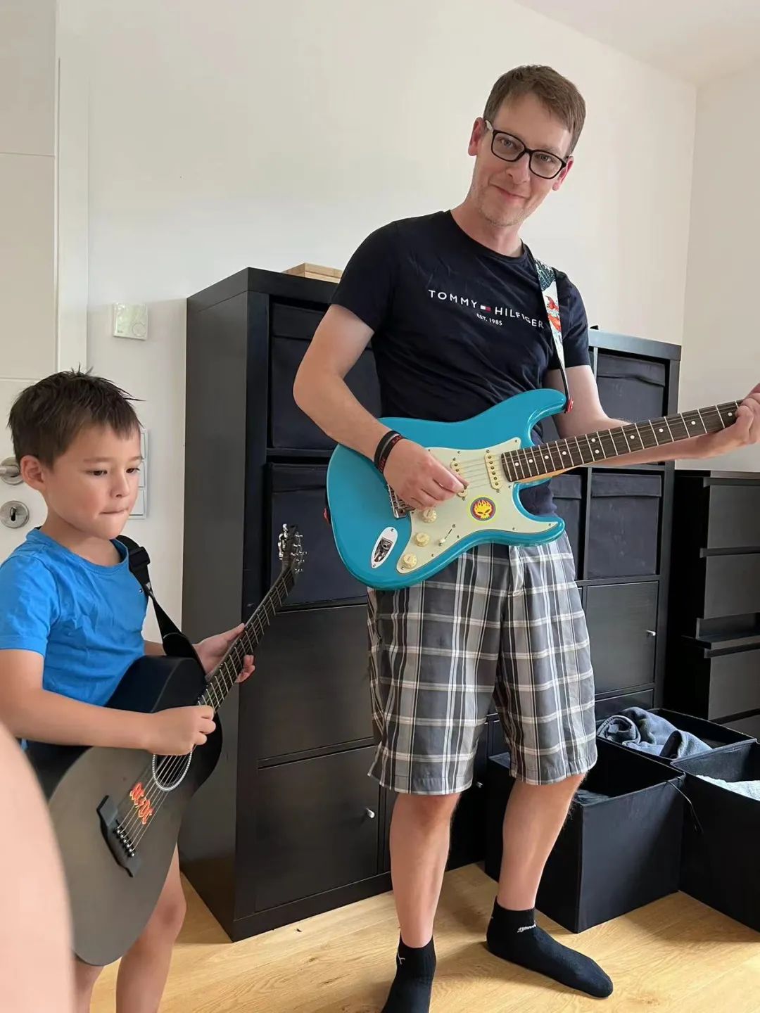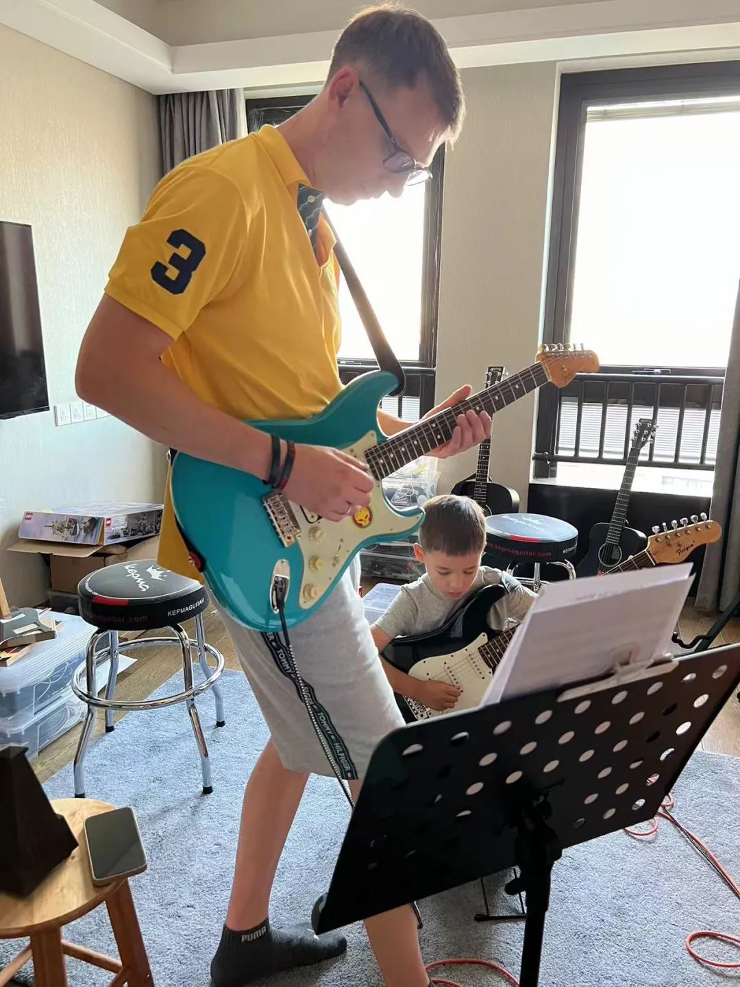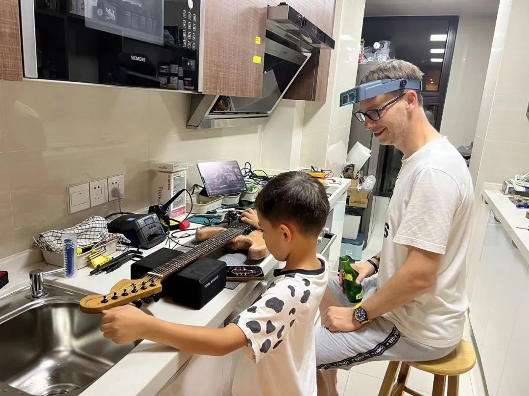 不知道從哪天起,他們倆愛上了搖滾巨星彈吉他的樣子,於是父子倆開始反覆觀摩AC/DC或是Metallica這樣的頂級樂隊演出時的視頻,並且一邊幻想,如果自己也能站在舞台上該有多好。