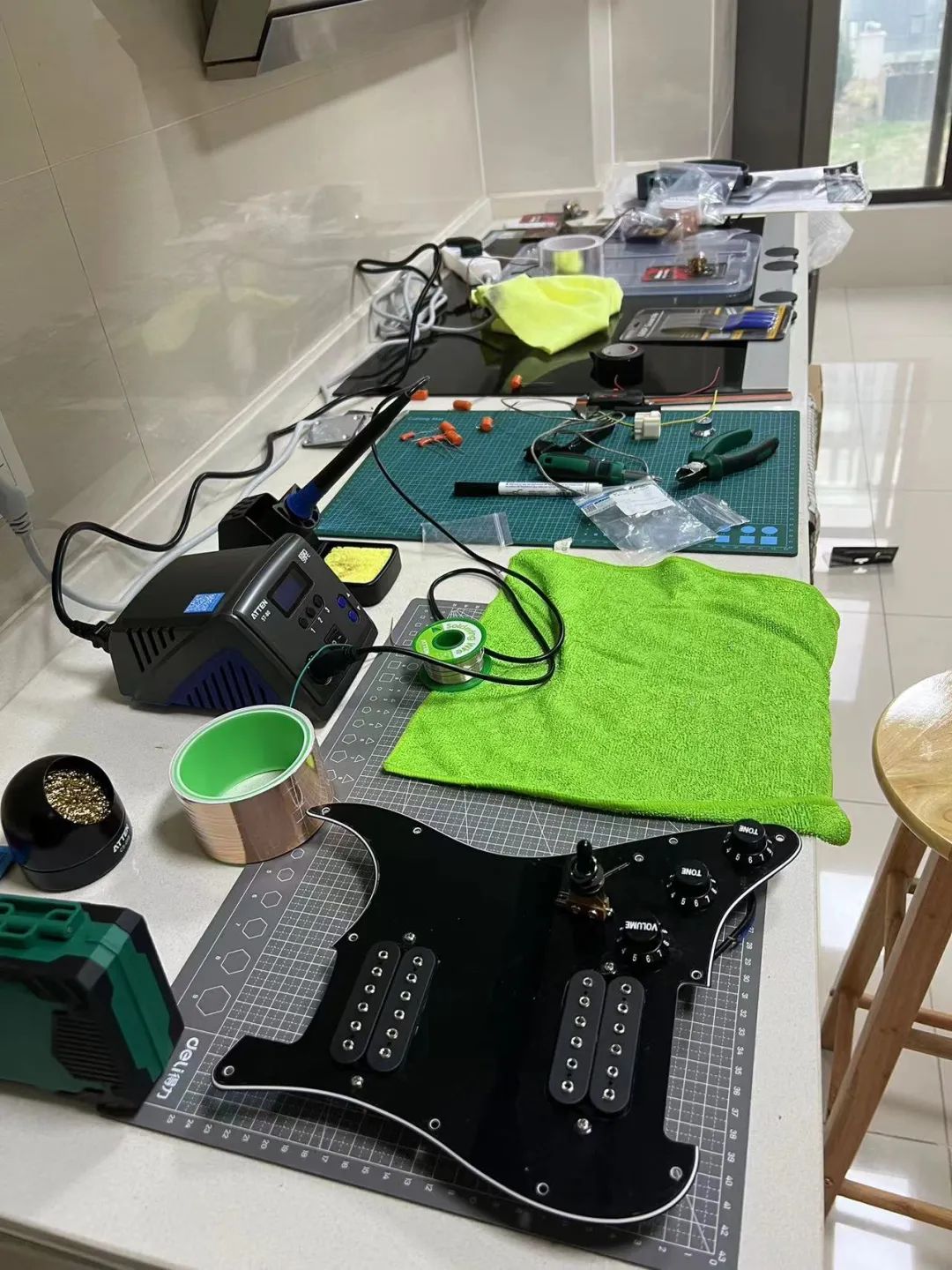 好傢伙!枱面上躺着一把新的吉他,而房間的角落裏放着一台鑽孔機!