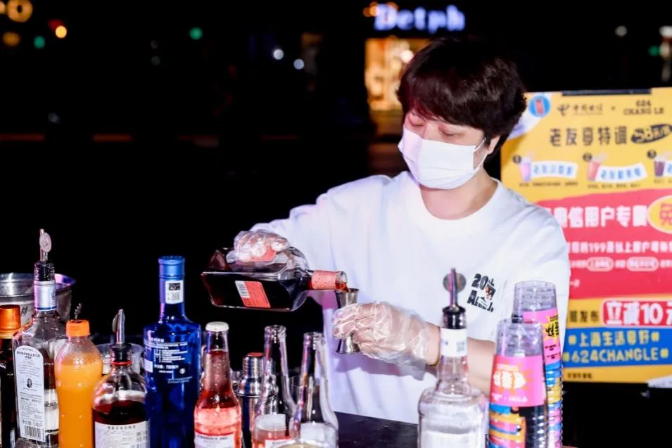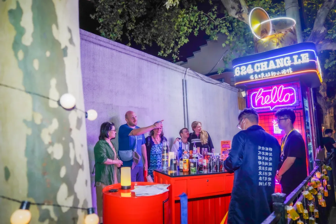 細雨朦朧,道路兩旁的法國梧桐披着昏黃燈光,樹下霓虹閃爍,情懷縹緲。一方工業風的吧枱,一隻冰桶,幾隻搖酒壺,各色基酒、果汁、糖漿,還有來自624CHANGLE的調酒師坐鎮。年輕人在最小公路酒亭旁的馬路牙子上充當“氛圍組”,拿着酒杯拗上幾個造型拍照,上傳社交網絡評論道:“沒有哪裏比得上上海的夜生活”“淺去下班味”“都市焦慮症的解藥”。
