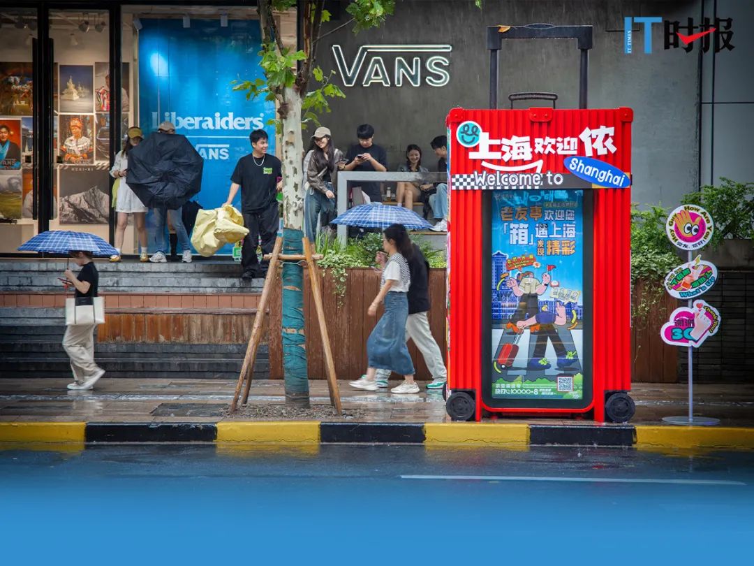 公話亭,正成為上海入境遊的一個窗口。近日,在淮海中路出現了一個巨型行李箱,便是由公話亭改造而成的街頭藝術裝置——上海電信“完美箱伴”亭,“上海歡迎儂”“我推薦的上海第1站”等標語十分醒目,一秒帶入在上海CityWalk的潮流氛圍。